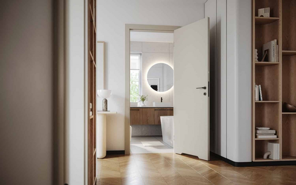 Moderní design – zárubeň HYDRO PROTECT™ ladí s ostatními zárubněmi ze série PORTA SYSTEM a PORTA SYSTEM ELEGANCE, takže ji lze snadno přizpůsobit interiéru koupelny.